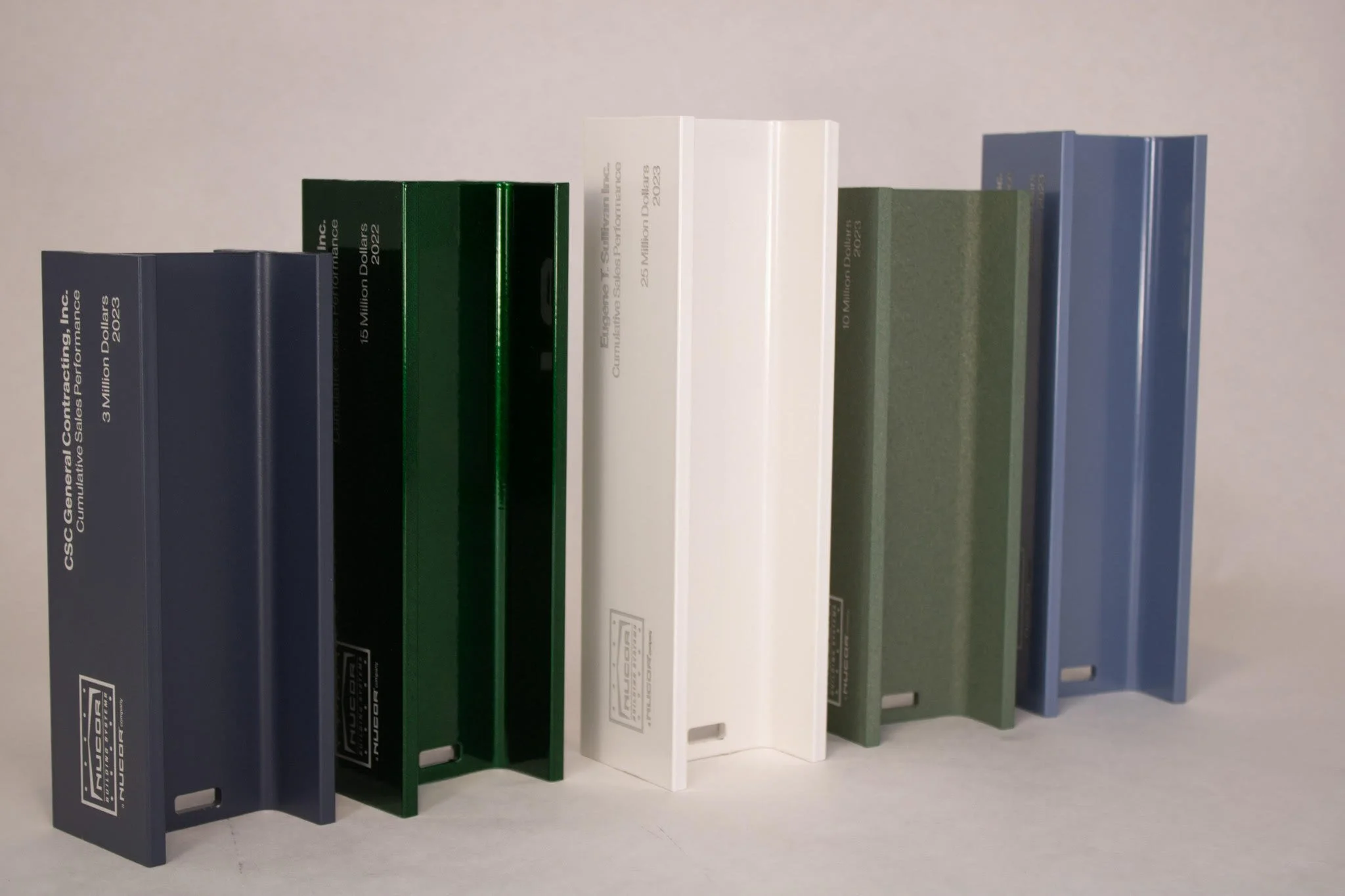 Example: The Nucor I-Beam Awards illustrate this concept. Created for one of the world’s leading steel companies, each award is a powder-coated aluminum I-beam, color-coded and sized according to achievement level. Precision-machined details and engraved personalization highlight strength, productivity, and progress. Years of service are engraved into each piece, creating recognition that honors both the individual and the organization’s ongoing success. These awards communicate to all employees that long-term dedication and measurable contributions are acknowledged and celebrated with care.