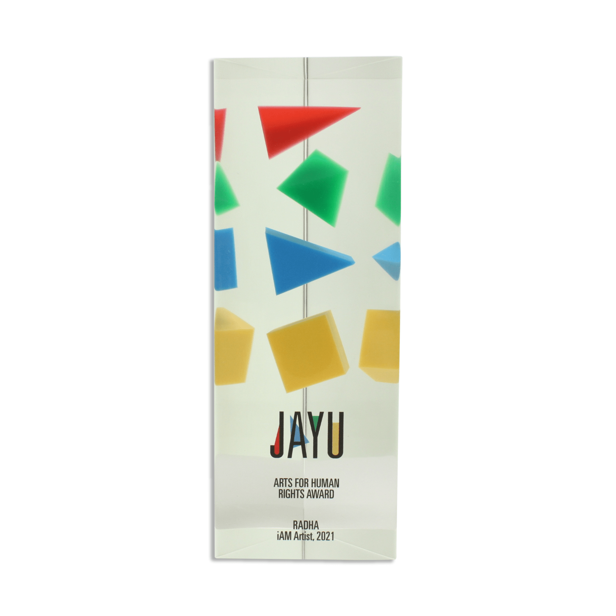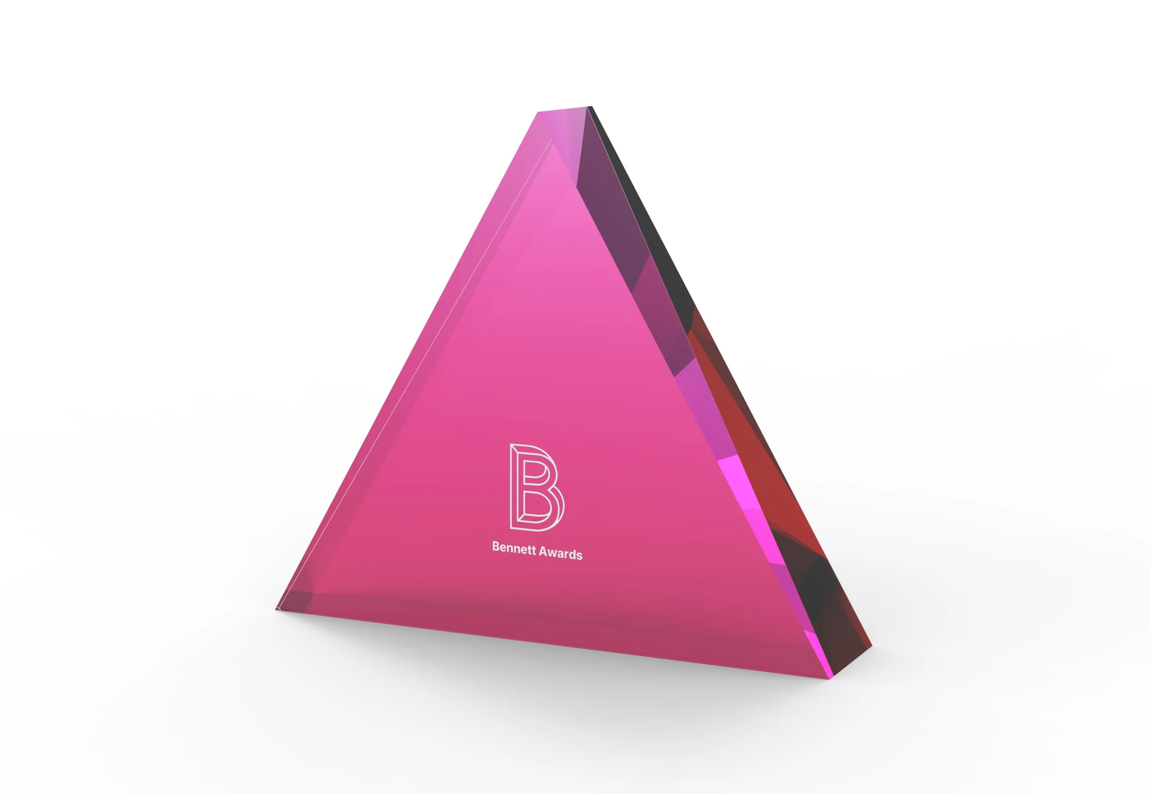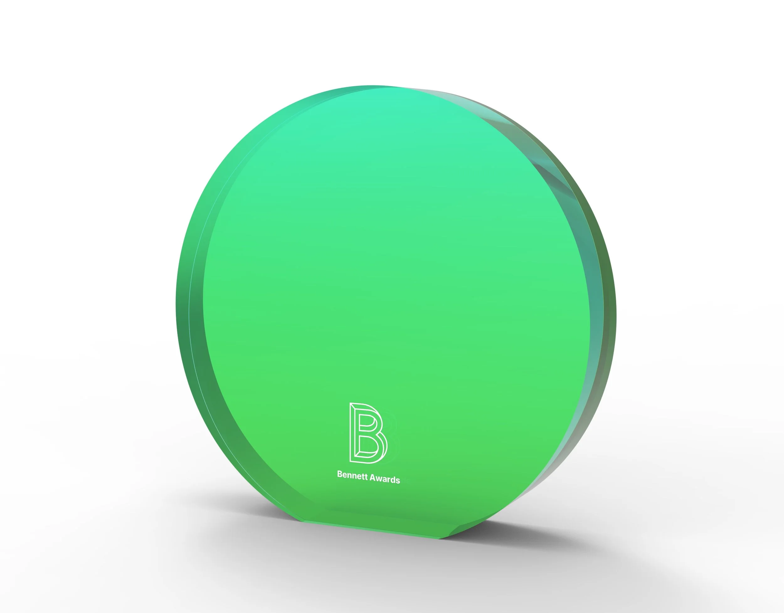 Acrylic awards can be translucent or opaque. Translucent acrylic awards can be fully clear, or in a colored tint. Translucent awards are the preferred route when incorporating direct digital printing on the back surface (front-facing) of an award, or when embedding an actual object in the award (both concepts explained below). Colored opaque awards can be single- or multi-colored.