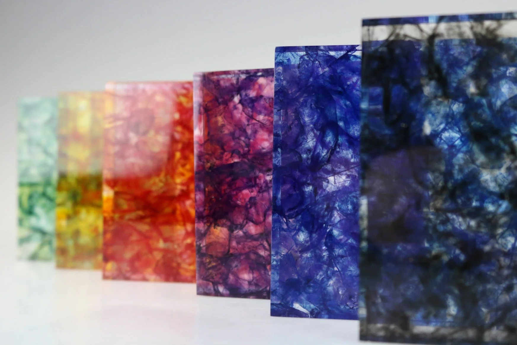 Constructed from up to 70% recycled industrial acrylic waste, and offered in an array of vibrant designs, effects and colors.