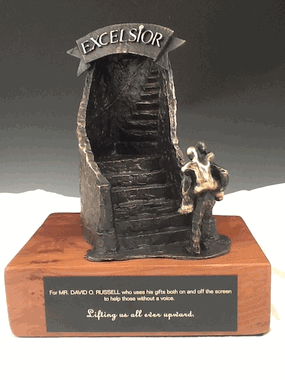 For this recognition award, The Glenholme School worked closely with Bennett Awards to create a custom sculpture award commemorating Mr. Russell’s personal efforts in championing mental health awareness, and championing the cause of The Glenholme School. The custom sculpture design was created by The Glenholme School’s Barbara Feeney, and sculpted by Bennett Awards artist Marjorie Coyne. The sculpture features an adult figure carrying a child figure on its back, ascending a long set of stairs that wind upward into a stairwell. The stairs are a combination of 3D sculpted images and bas-relief. The stairs represent the arduous journey those affected by mental health face, and the piggyback figures signify the beneficial support provided by others such as Mr. Russell in helping them move forward with their lives. At the top of the stairwell are the words “EXCELSIOR”, a mantra used by the character Bradley Cooper plays in the movie Silver Linings Playbook that, in Latin, means “ever upward.” The sculpture was cast in pewter, and featured an antique bronze finish. It was mounted on a handcrafted hardwood based with an engraved plate thanking Mr. Russell for his gifts and contributions.