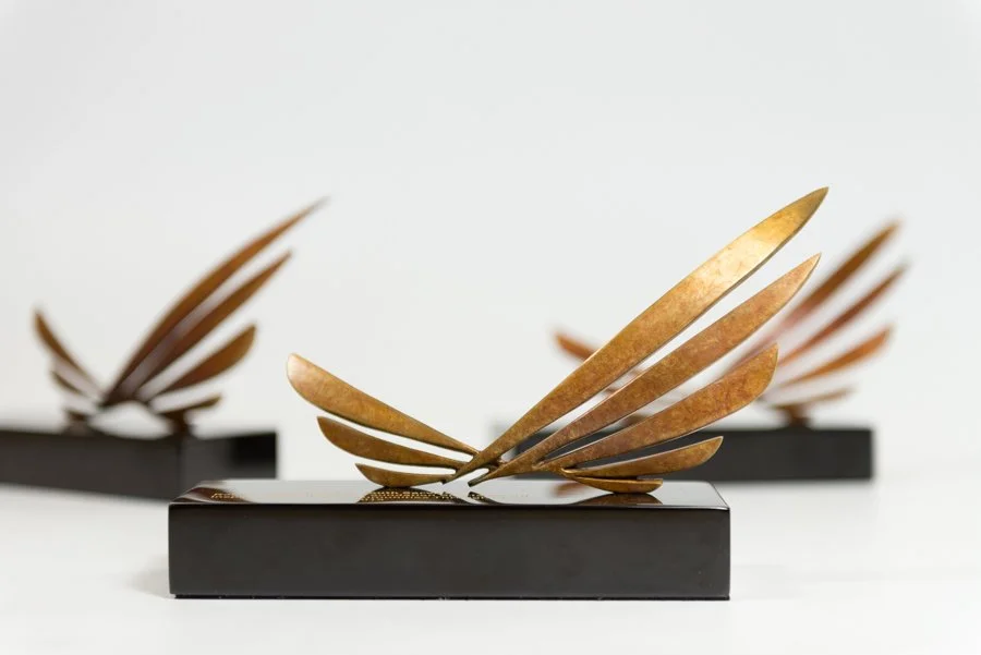 For this new recognition award, Bennett Awards worked with RWJF to create a new, unique custom award design based on the RWJF logo – a 3D interpretation of the logo in the form of a sculpture. After creating the custom award design and model, Bennett Awards produced the individual sculpture awards in bronze with gold patina and high-polished edges. The sculptures were mounted on rectangular black marble bases with gold-fill engraving on the top of the base.