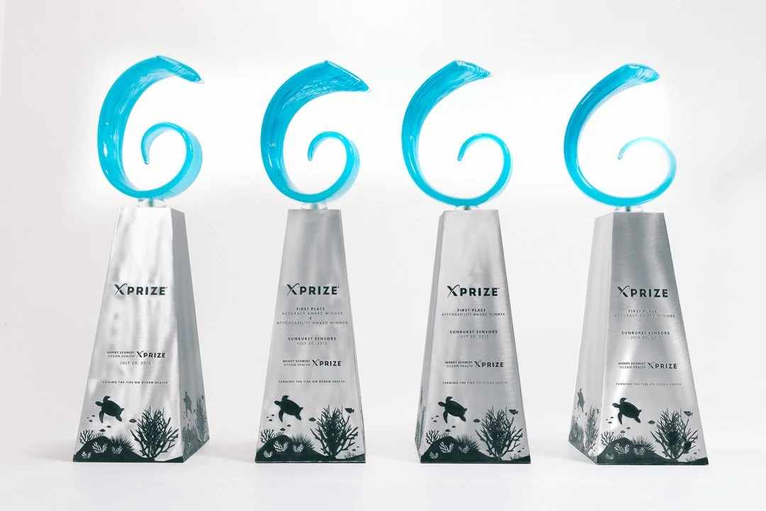 Bennett Awards created custom recognition awards for the $2M Wendy Schmidt Ocean Health XPRIZE, a global competition that challenged teams of engineers, scientists, and innovators from all over the world to create pH sensor technology to accurately and affordably measure the acidification of our oceans. XPRIZE is the leading organization solving the world’s Grand Challenges by creating and managing large-scale, high-profile, incentivized prizes in five areas: Learning; Exploration; Energy & Environment; Global Development; and Life Sciences. Bennett Awards collaborated with XPRIZE to create a new, unique custom award that combined both metal and glass.